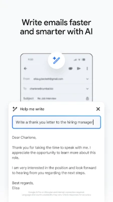 • Use Gemini* as your AI powered writing assistant right from your inbox, with built-in features like ‘Help me write’ and contextual Smart Reply